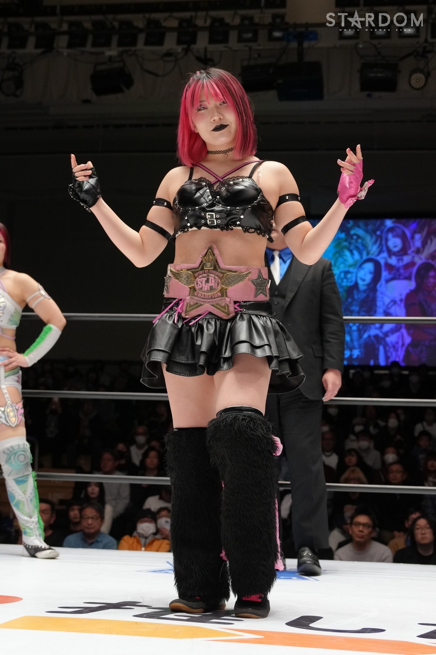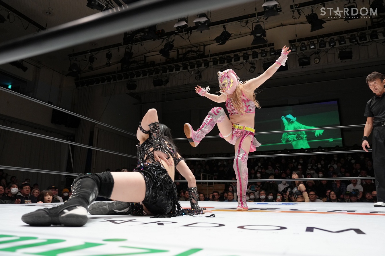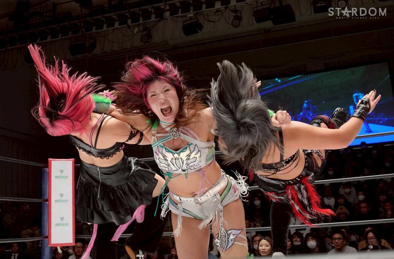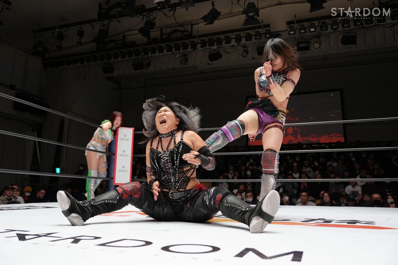 ネオジェネシスのスターライト・キッドとゴッズアイの朱里&壮麗亜美が合体し、H.A.T.E.の上谷沙弥&小波&吏南組と6人タッグマッチ。2・7大阪でワールド・オブ・スターダム王座戦を控える上谷とキッド、ワンダー・オブ・スターダム王座戦を闘う小波と壮麗には前哨戦。そこにIWGP女子&STRONG女子2冠王の朱里、フワちゃんにケンカを売った吏南が加わることでどんな化学反応が見られるか? そして、2・7に向けて弾みをつけるのは?