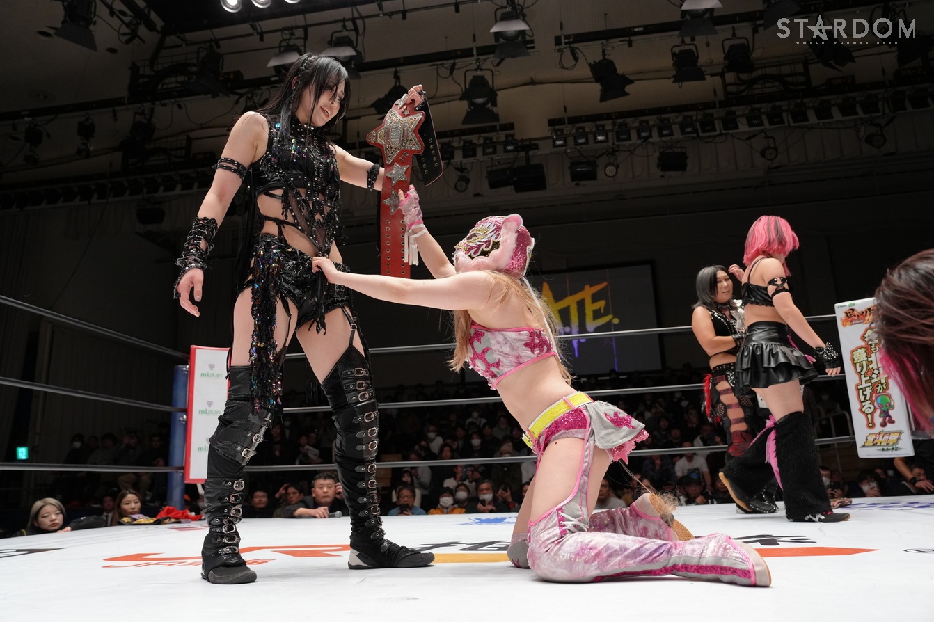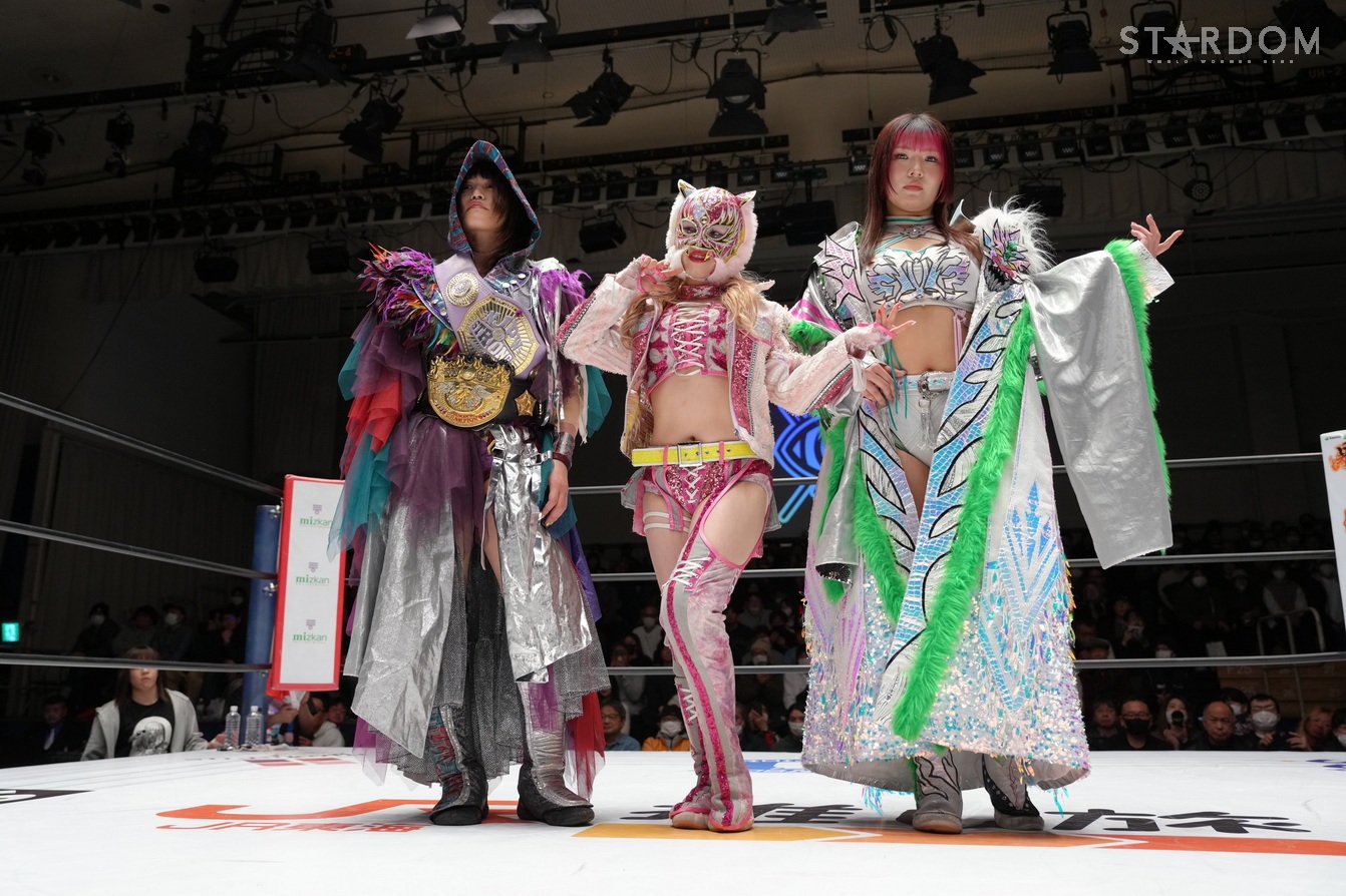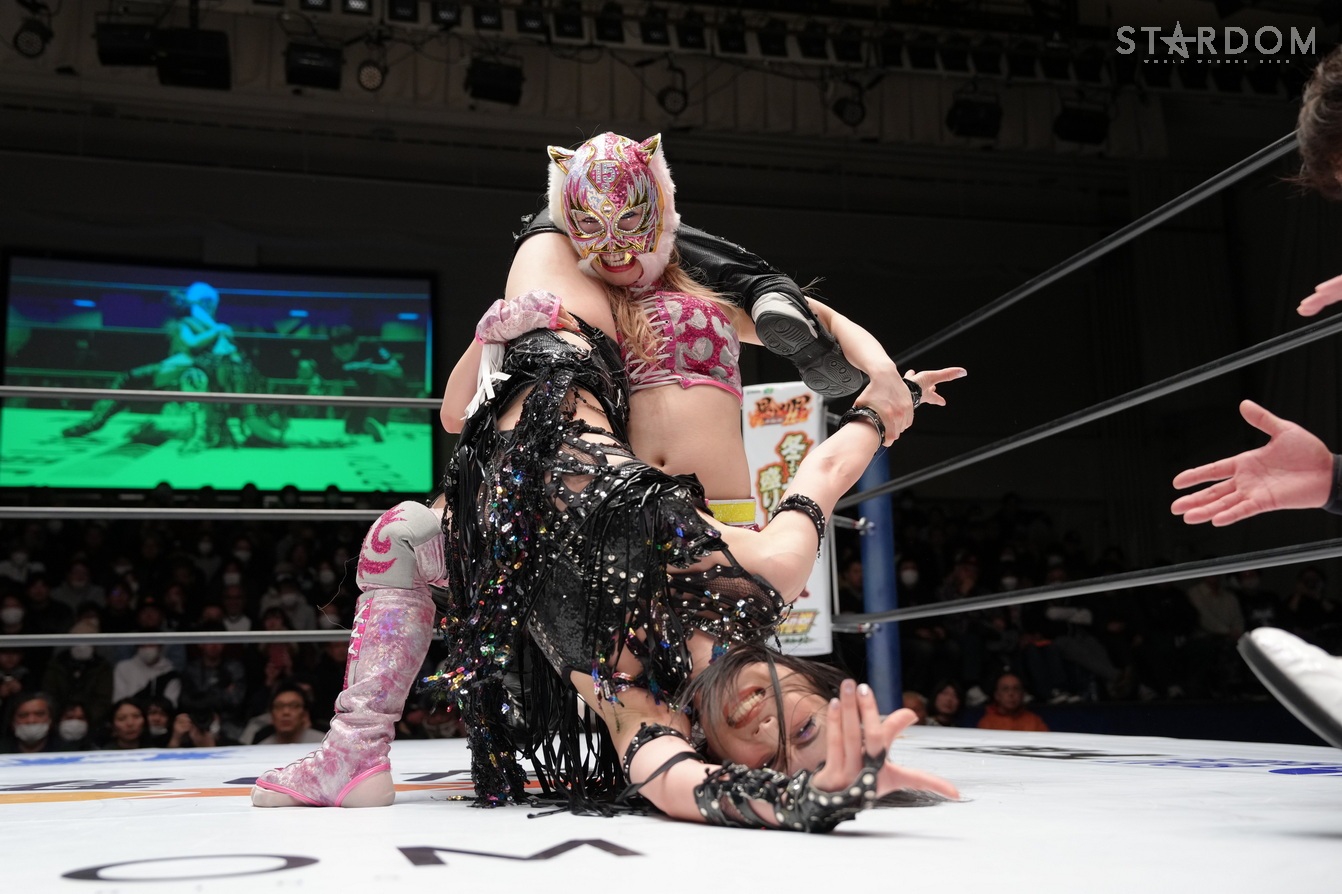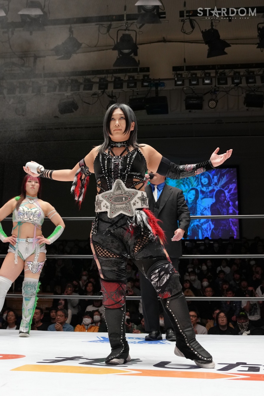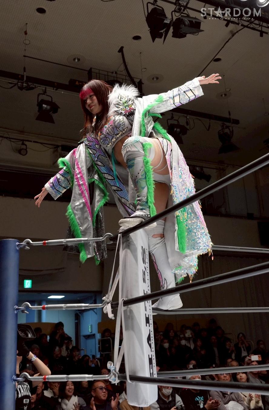 ネオジェネシスのスターライト・キッドとゴッズアイの朱里&壮麗亜美が合体し、H.A.T.E.の上谷沙弥&小波&吏南組と6人タッグマッチ。2・7大阪でワールド・オブ・スターダム王座戦を控える上谷とキッド、ワンダー・オブ・スターダム王座戦を闘う小波と壮麗には前哨戦。そこにIWGP女子&STRONG女子2冠王の朱里、フワちゃんにケンカを売った吏南が加わることでどんな化学反応が見られるか? そして、2・7に向けて弾みをつけるのは?