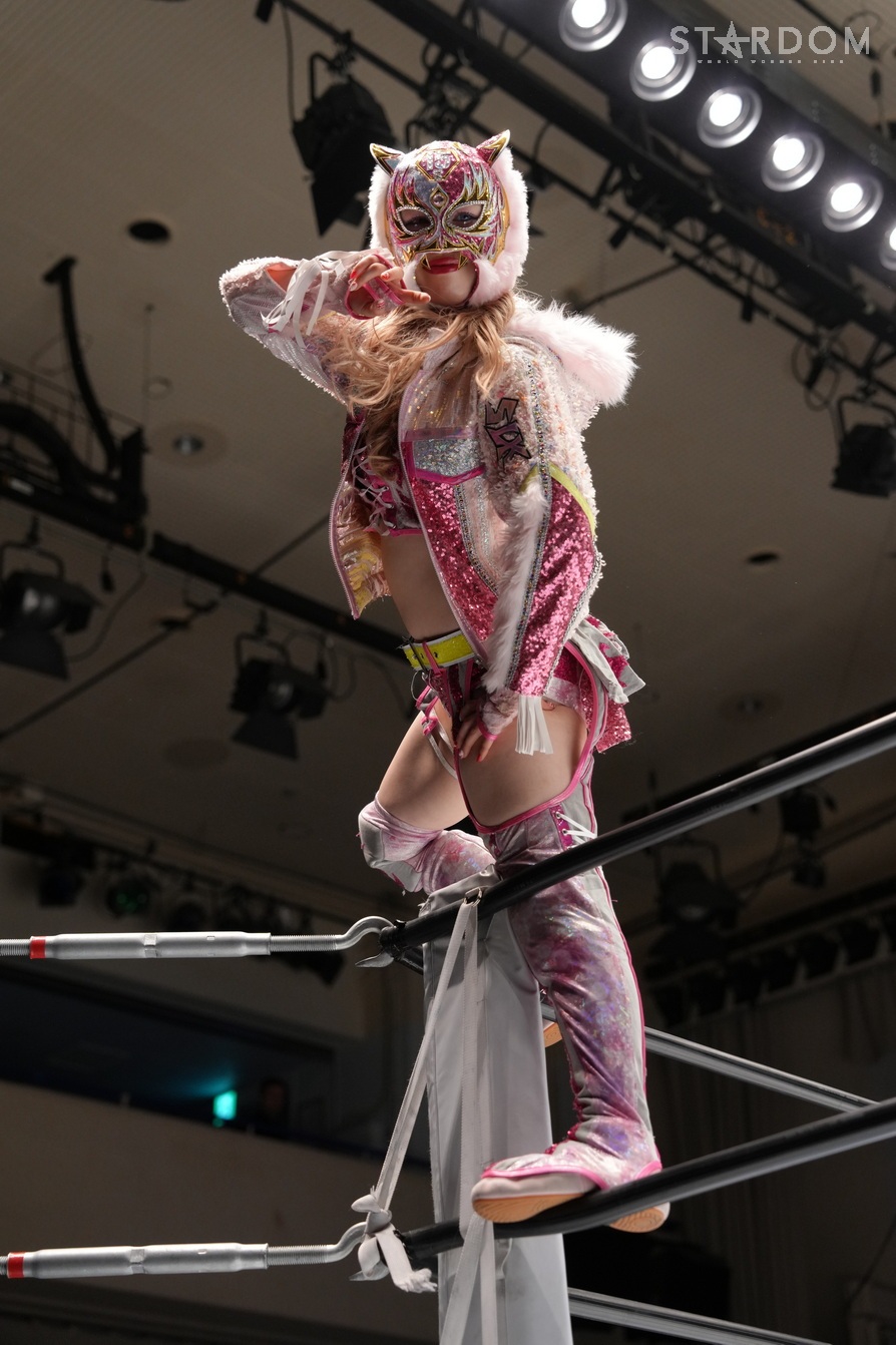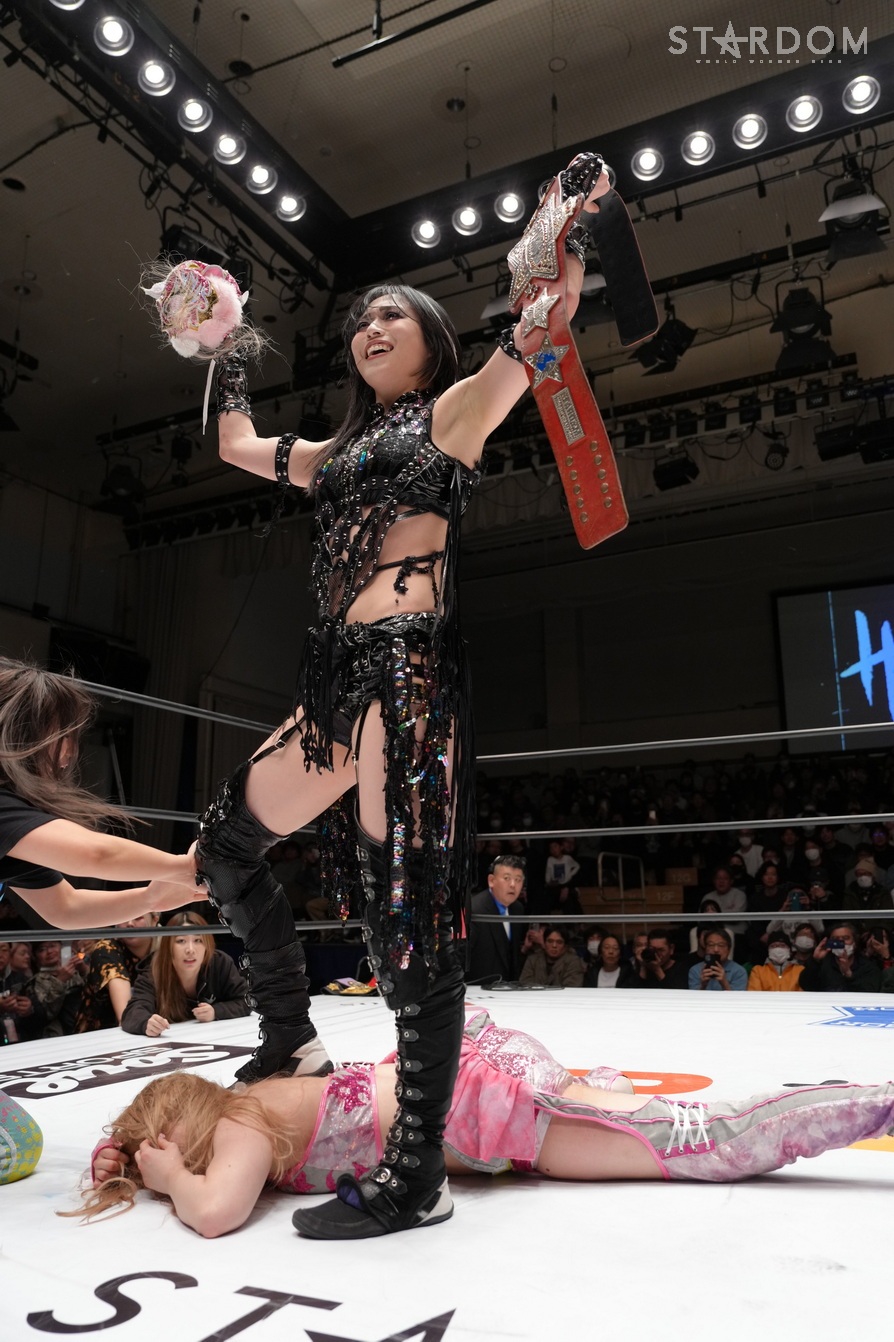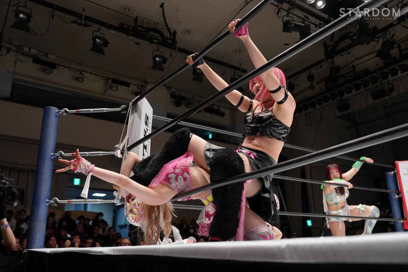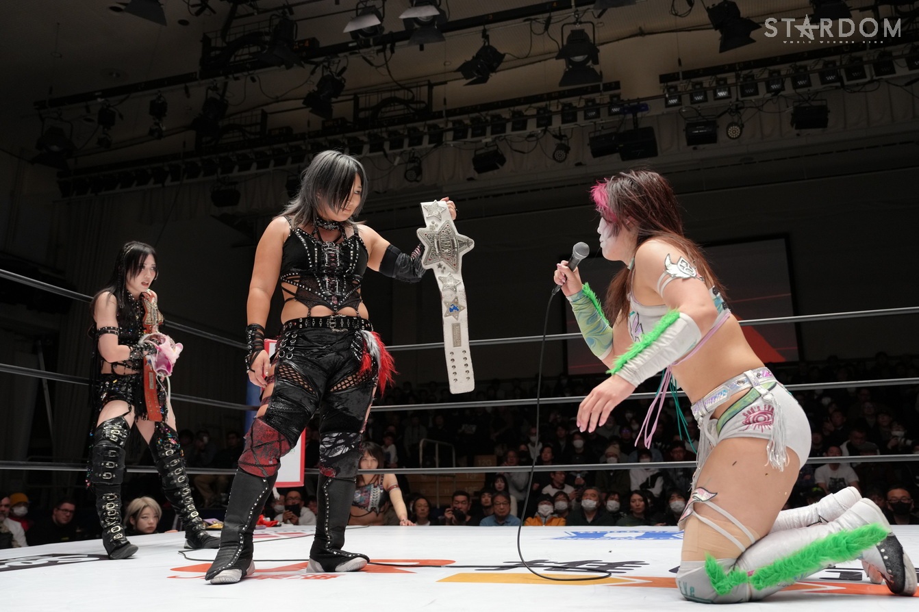 ネオジェネシスのスターライト・キッドとゴッズアイの朱里&壮麗亜美が合体し、H.A.T.E.の上谷沙弥&小波&吏南組と6人タッグマッチ。2・7大阪でワールド・オブ・スターダム王座戦を控える上谷とキッド、ワンダー・オブ・スターダム王座戦を闘う小波と壮麗には前哨戦。そこにIWGP女子&STRONG女子2冠王の朱里、フワちゃんにケンカを売った吏南が加わることでどんな化学反応が見られるか? そして、2・7に向けて弾みをつけるのは?