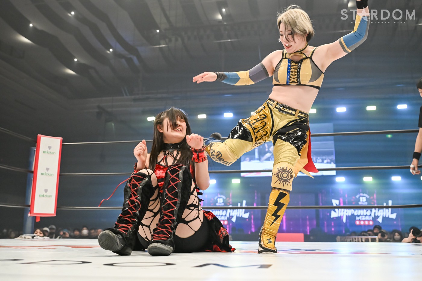 古沢が名乗りを挙げて、ともかと対峙。ともかがヘッドロックから腕を取る。古沢が足を取りにいくと、ともかが腕十字狙い、古沢が反転してカバー。古沢がアームホイップからアンクルホールド狙い。ともかがロープに逃れると、古沢の突進をかわしてアンクルを取るがロープ際。ならばとともかは、二段蹴りからサッカーボールキック。妃南が古沢にボディースラムの連続。八神が古沢にサッカーボールキックの連打。古沢が返すと、八神に変型コルバタからドロップキック。玖麗が八神へ串刺しエルボー。そこへともかが乱入するが、玖麗がドロップキック連打で分断して排除する。八神が返すと、玖麗はスリーパー。切り返した八神がPK、玖麗が反転してエルボーアタック、エルボードロップ。金屋がタッチを申し出て、八神にドロップキック4連発。金屋は八神にボディースラムの構え。八神が切り返してドロップキック、PK。妃南が金屋にドロップキック。金屋が妃南にエルボー連打、ドロップキック、アームホイップから背中にドロップキック。玖麗が妃南へドロップキックを連発。妃南がボディースラムで叩きつけると、玖麗とエルボーの打ち合い。ともかが玖麗の突進を妨害し、妃南が払い腰、STF。玖麗がエスケープすると、妃南の突進をかわし、古沢と金屋のアシストからミサイルキック、スイングネックブリーカー。妃南が返すと、玖麗はスピアで突進。しかし、妃南がかわして外道クラッチ。古沢と金屋がドロップキックの挟み撃ちでカット。八神とともかのミドルから妃南が玖麗へ変型ロックボトム、変型バックドロップ。玖麗がかいくぐりスピアもカットされる。玖麗はときめきカッターにいくが、妃南が止めて旋回して叩きつける。玖麗がカバーを反転。返した妃南が滞空時間をとって変型ジャックハマー、さらにコーナーからマッドスプラッシュ投下。3カウントが入り、妃南が玖麗から勝利した。