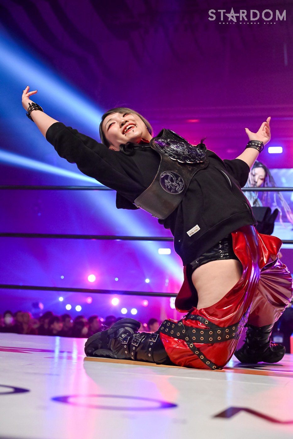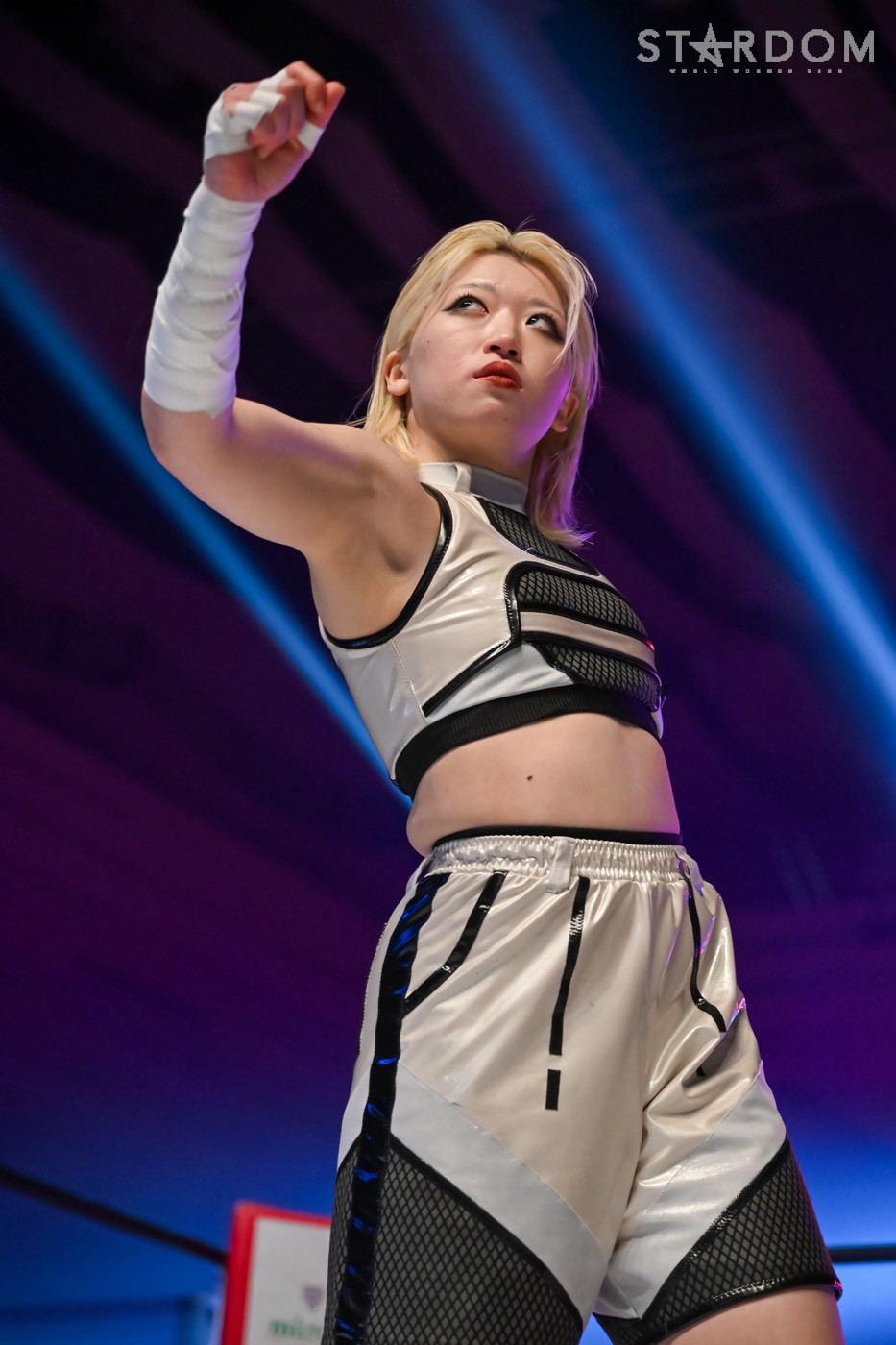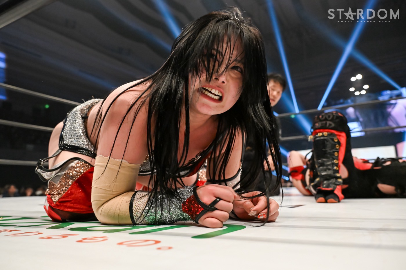 最後の大将戦で、時間無制限1本勝負の梨杏vsアキラ。ドロップキックが交錯し、エルボーの打ち合い。アキラがカウンターでドロップキック、ボディースラム狙いは梨杏がこらえる。アキラの突進に梨杏がクロスボディーアタック、顔面へドロップキック。梨杏はコーナーに上がるが、アキラが追いついてエルボー連打でエプロンに落とす。アキラが引っ張り上げてエルボー、梨杏がかわしてスタナー。梨杏はコーナーからダイビングボディーアタック、返されるとスリーパーへ。エスケープさせずに胴締めに移行。しかし、アキラがエスケープ成功。梨杏はフィッシャーマン狙い。アキラがこらえて張り手。梨杏も張り手を打ってフィッシャーマンを決める。アキラが返すと、梨杏が飛びつく。アキラが切り返して蹴飛ばし、引き起こしてニーアタック。梨杏がかわして丸め込む。アキラが返してカウンターでドロップキック、ニー。梨杏が返すと、アキラはハーフハッチスープレックス。ホールドするが、梨杏が返す。アキラはサブミッション。変型アームロックを決めると、梨杏がギブアップ。アキラの勝利でMVLがEXVを破った。