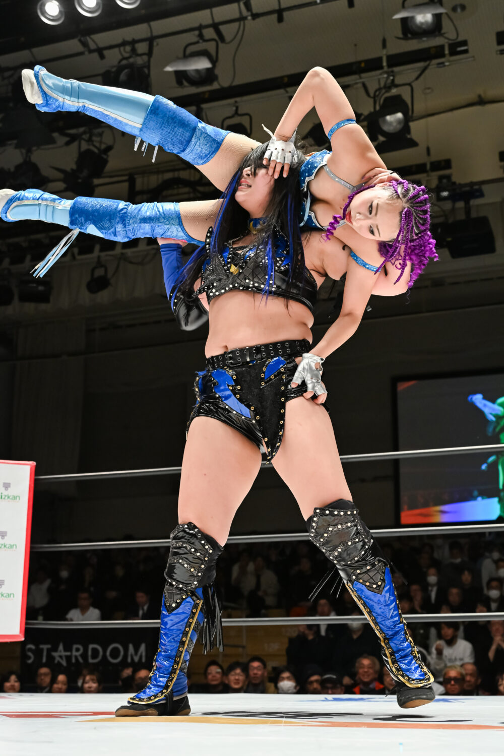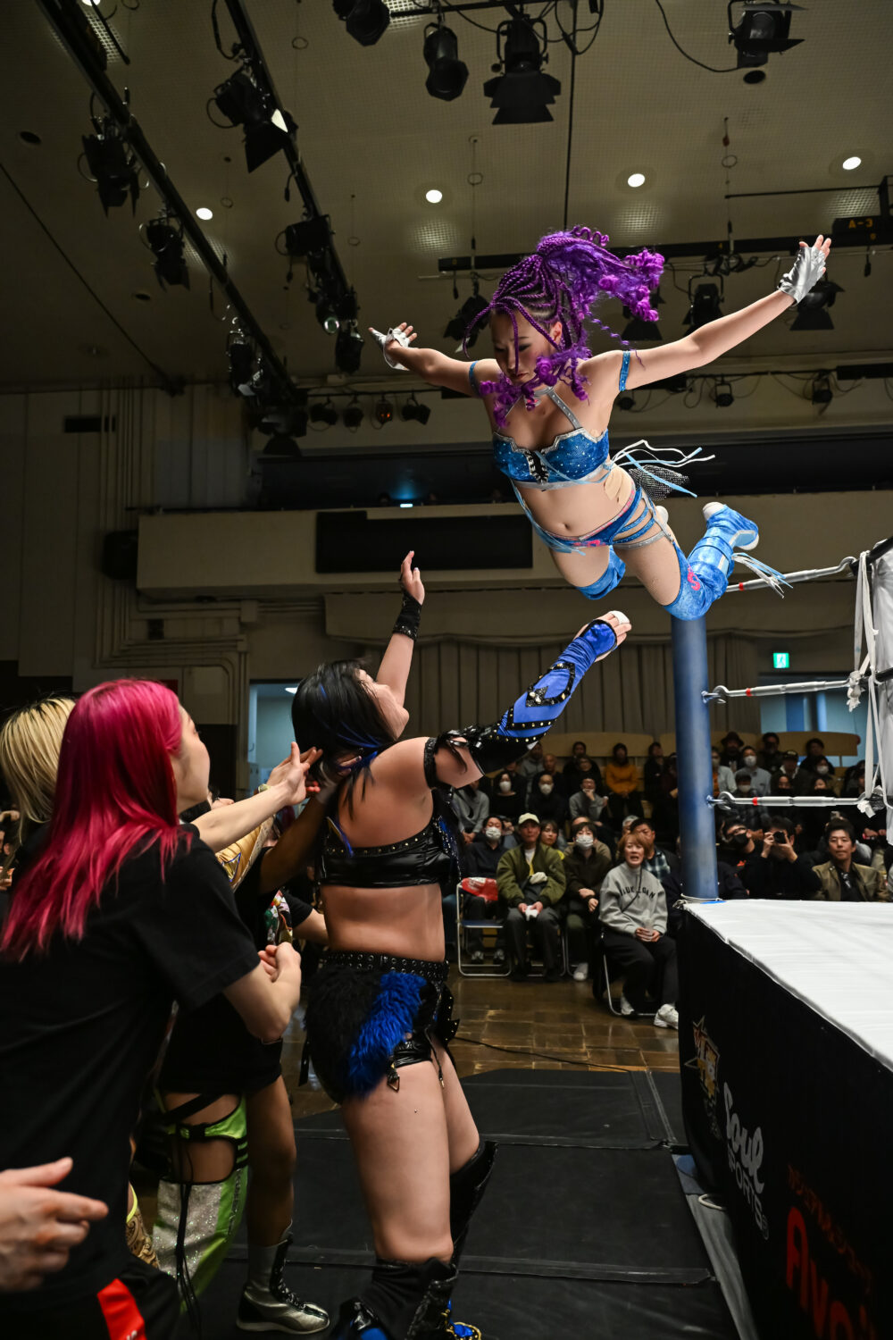 姫の首4の字固めから脱出すると、プランチャも耐え抜く。最後は12分3秒、JPコースターが決まり勝利を収めた。
