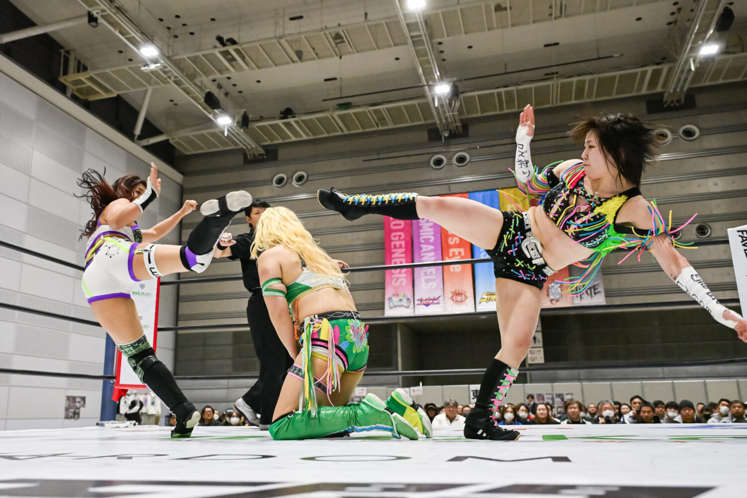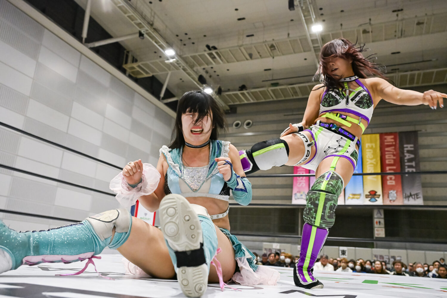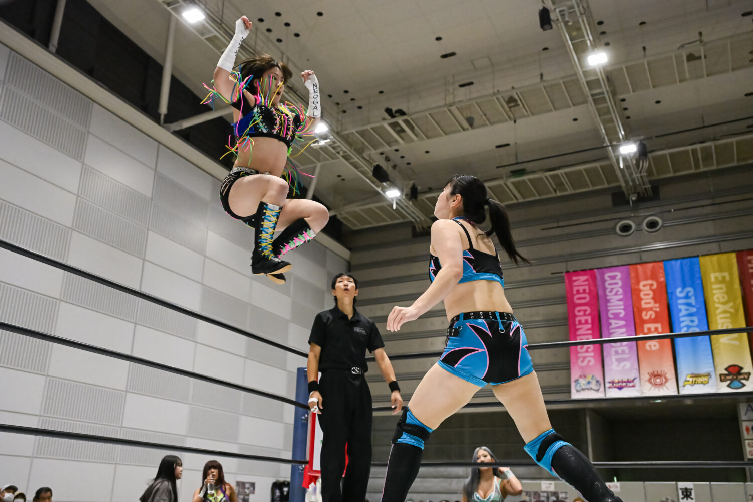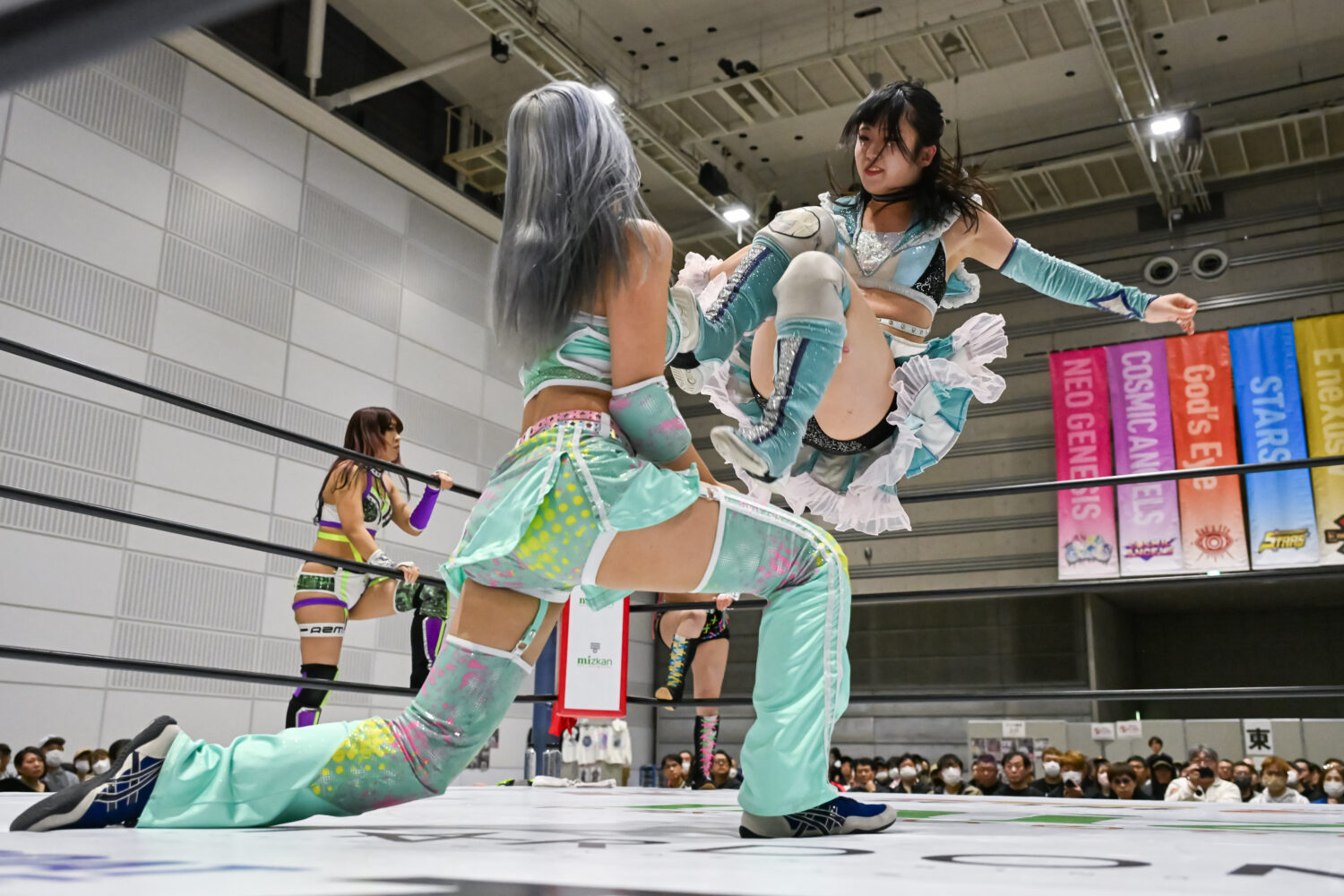玖麗と天咲が先発に名乗り。ロックアップで組み合い、バックの取り合い。玖麗が腕を取ると、天咲が回転して取り返す。玖麗もやり返してアームホイップからドロップキック。玖麗がロープに振ろうとするとネオジェネが乱入してトリプルドロップキック。星来が玖麗をコーナーに固定してドロップキック10連発。AZMが玖麗にサッカーボールキックを連打。玖麗が返してエルボー連打、AZMがドロップキックをかわして投げを狙うが、玖麗がこらえる。AZMはワキ固めにとって腕固めへ。さくらがカットして玖麗と合体攻撃、2方向からミサイルキックを放つ。さくらがAZMにドロップキック、ボディースラム。AZMが返すと、さくらがミドルキック連打。AZMが「なめんな!」とブレーンバスター。星来がさくらにラリアット、ミサイルキック、カバーの連続。しのいださくらがブレーンバスターをかわしてミドルキック。水森が星来にラリアット連打、ギロチンドロップ。星来が返すと、水森とエルボーの打ち合い。水森が星来をかいくぐり、さくらと玖麗のドロップキックから水森がラリアット、サブミッション。星来がエスケープすると、水森が狙いすまして突進。星来がかわすとAZM、天咲が次々と串刺し攻撃、ネオジェネがトリオでドロップキック、天咲がDDT、星来とAZMでキックの挟み撃ち。水森がスーパーガールにいくが星来かわして丸め込みの応酬。水森の突進に星来がドロップキック、ブレーンバスター。カットされた星来だが、水森を引き起こしチェックメイト狙い。水森がこらえてラリアット、星来がトラースキック。ジャーマン狙いをかわして水森がスーパーガールで3カウントを奪った。