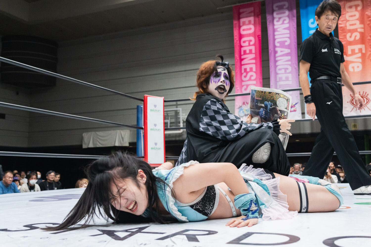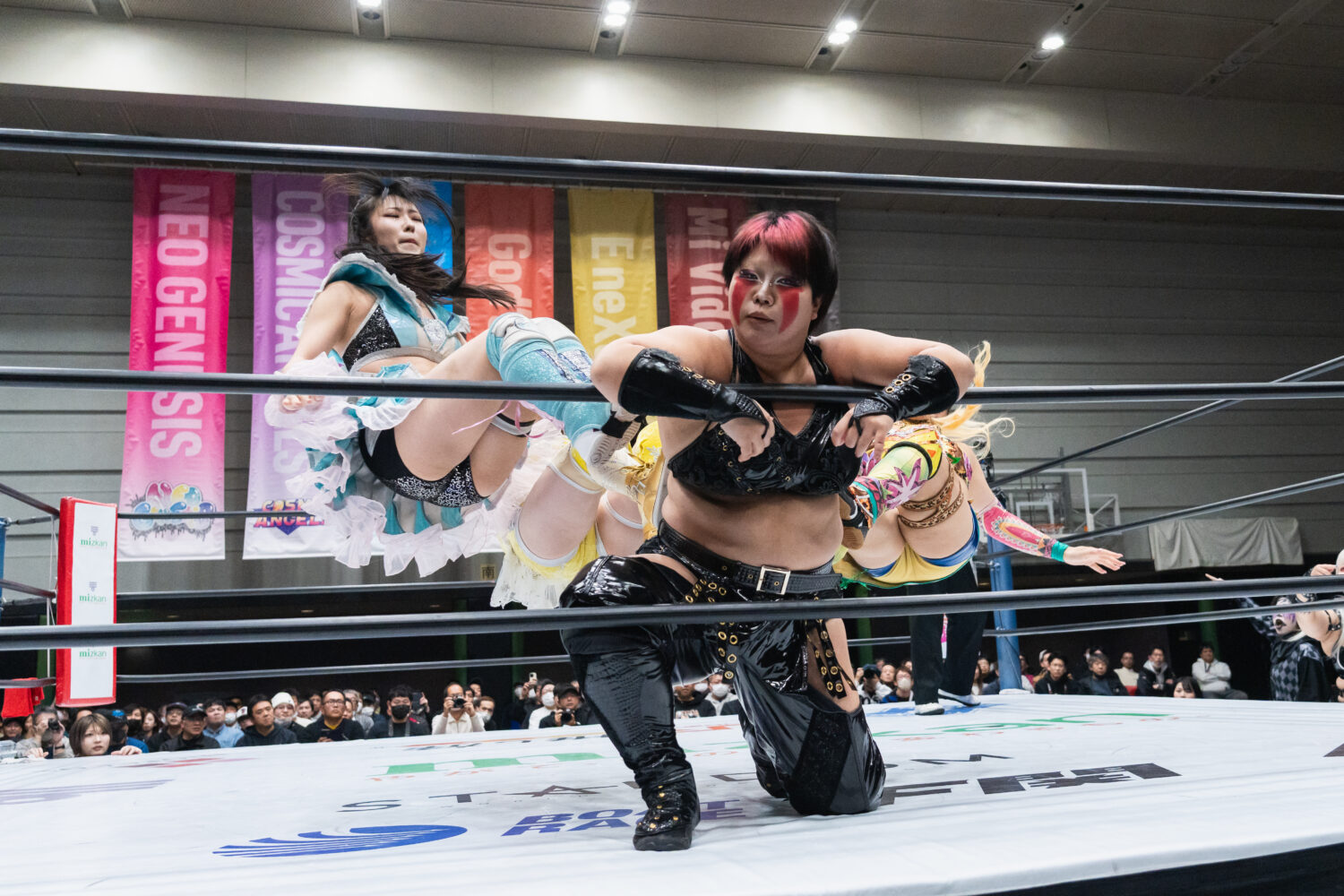 コズミックエンジェルズのなつぽい&水森由菜&さくらあや&玖麗さやか組とH.A.T.E.の刀羅ナツコ&琉悪夏&吏南&フキゲンです★組が8人タッグマッチで激突。12・29両国でゴッデス王座戦をおこなうナツコ&琉悪夏組とさくら&玖麗組には連日にわたる前哨戦となる。前日の今治では10人タッグマッチで玖麗が琉悪夏にフォールされた。前日のリベンジとともに劣勢を跳ね返したいコズエンだが…。さくららの奮起に期待がかかる。
